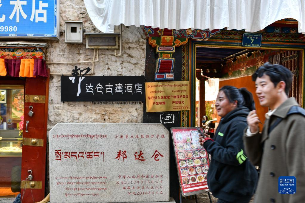 西藏拉萨市民走过八廓街老城区邦达仓古建酒店(2023年3月24日摄)。新华社记者 晋美多吉 摄
