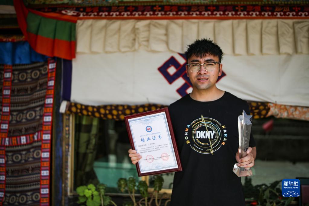 “格桑花开”大学生就业创业特训营学员、江苏今世缘酒业股份有限公司甘青藏大区业务经理土旦平措展示特训营结业证书和“区外就业之星”奖杯(2022年6月23日摄)。新华社记者 姜帆 摄