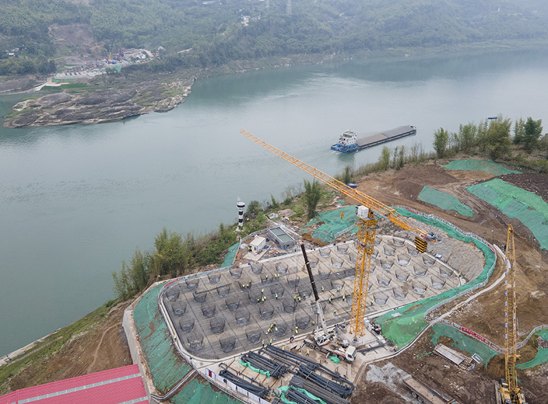 3月29日,施工人员在重庆市涪陵区石沱长江大桥北岸主塔的施工现场作业。