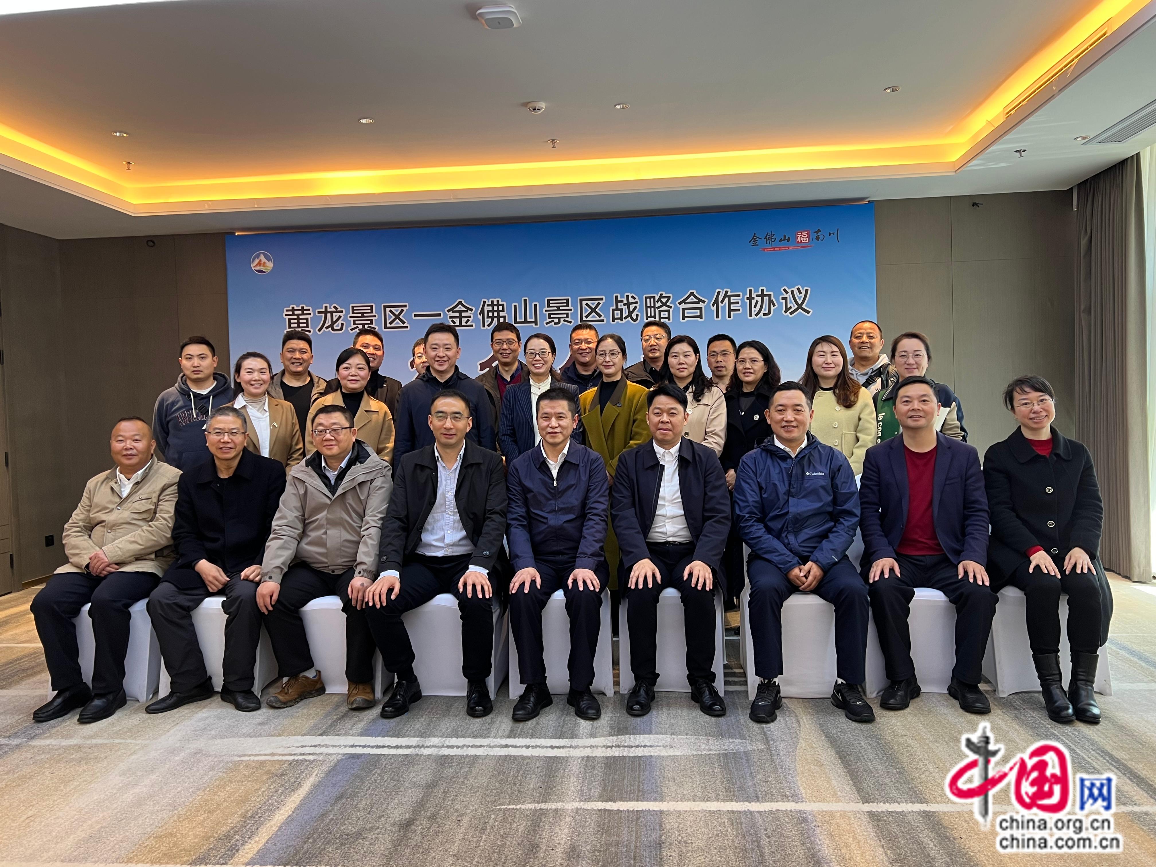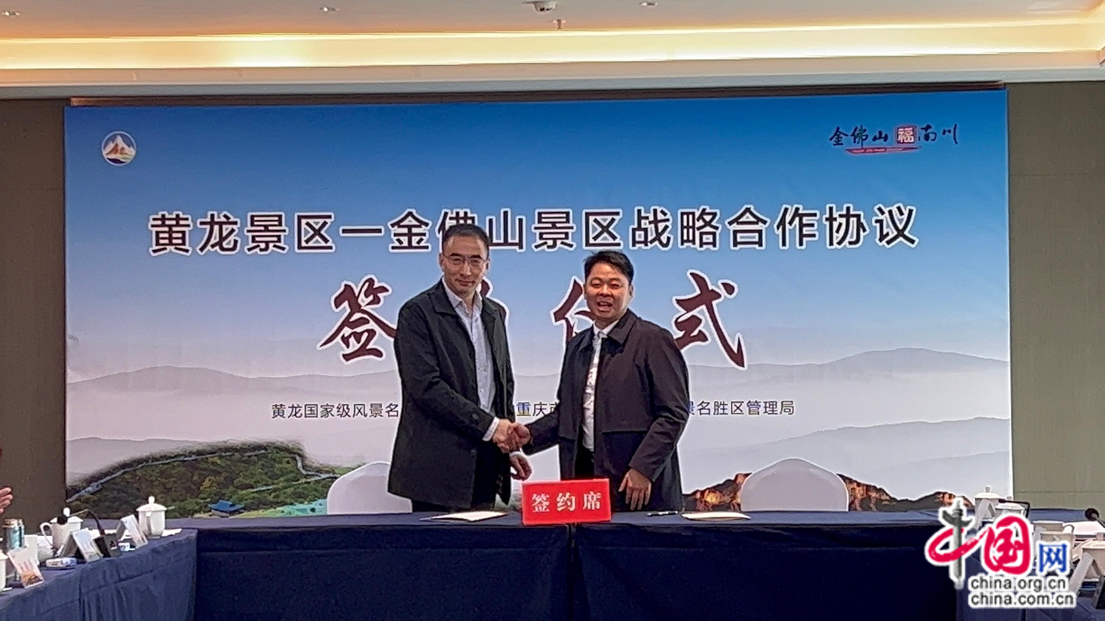 为全力推进省州文旅融合高质量发展及全域旅游发展要求,推动巴蜀文化旅游走廊建设,2023年3月30日,黄龙景区与金佛山景区在重庆市南川区举行了战略合作座谈会,黄龙管理局与金佛山管理局签署了《重庆市南川区金佛山风景名胜区管理局 黄龙国家级风景名胜区管理局 金佛山景区与黄龙景区战略合作协议》。南川区人大副主任梁正忠等领导见证合作协议签订。