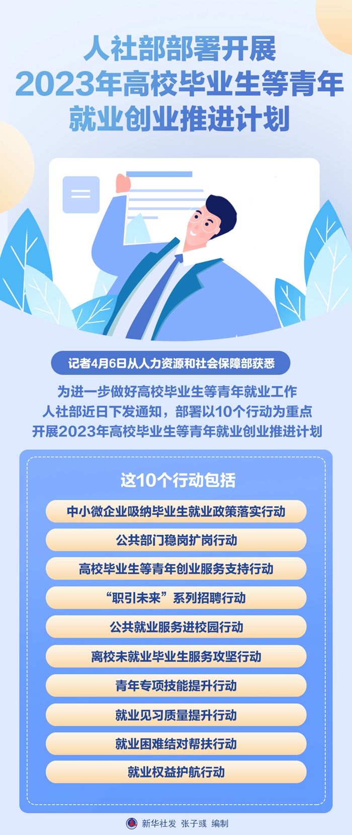 新华社北京4月6日电(记者姜琳)记者6日从人力资源和社会保障部获悉,为进一步做好高校毕业生等青年就业工作,人社部近日下发通知,部署以10个行动为重点,开展2023年高校毕业生等青年就业创业推进计划。