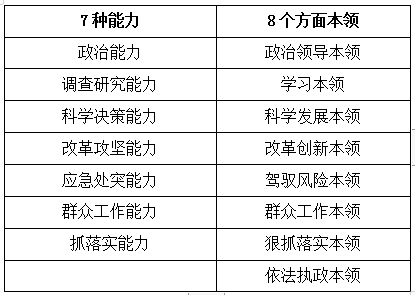 “八个方面本领”与“七种能力”也是相互呼应的。如前所述,习近平总书记针对年轻干部提出的六个方面的要求中,有一条是“勤学苦练,增强本领”。增强学习本领是十九大报告中提出的八个方面本领中的第一条。古人云:“书山有路勤为径,学海无涯苦作舟”。对于领导干部来说,勤学苦练的主要目的就在于提高“七种能力”,增强“八个方面本领”。在上述示意图中,笔者用椭圆形来框定标出“七种能力”和“八个方面本领”,如两翼展开在两侧,与习近平总书记提出的“123456”一起,共同组成干部标准要求与能力本领的完整体系。