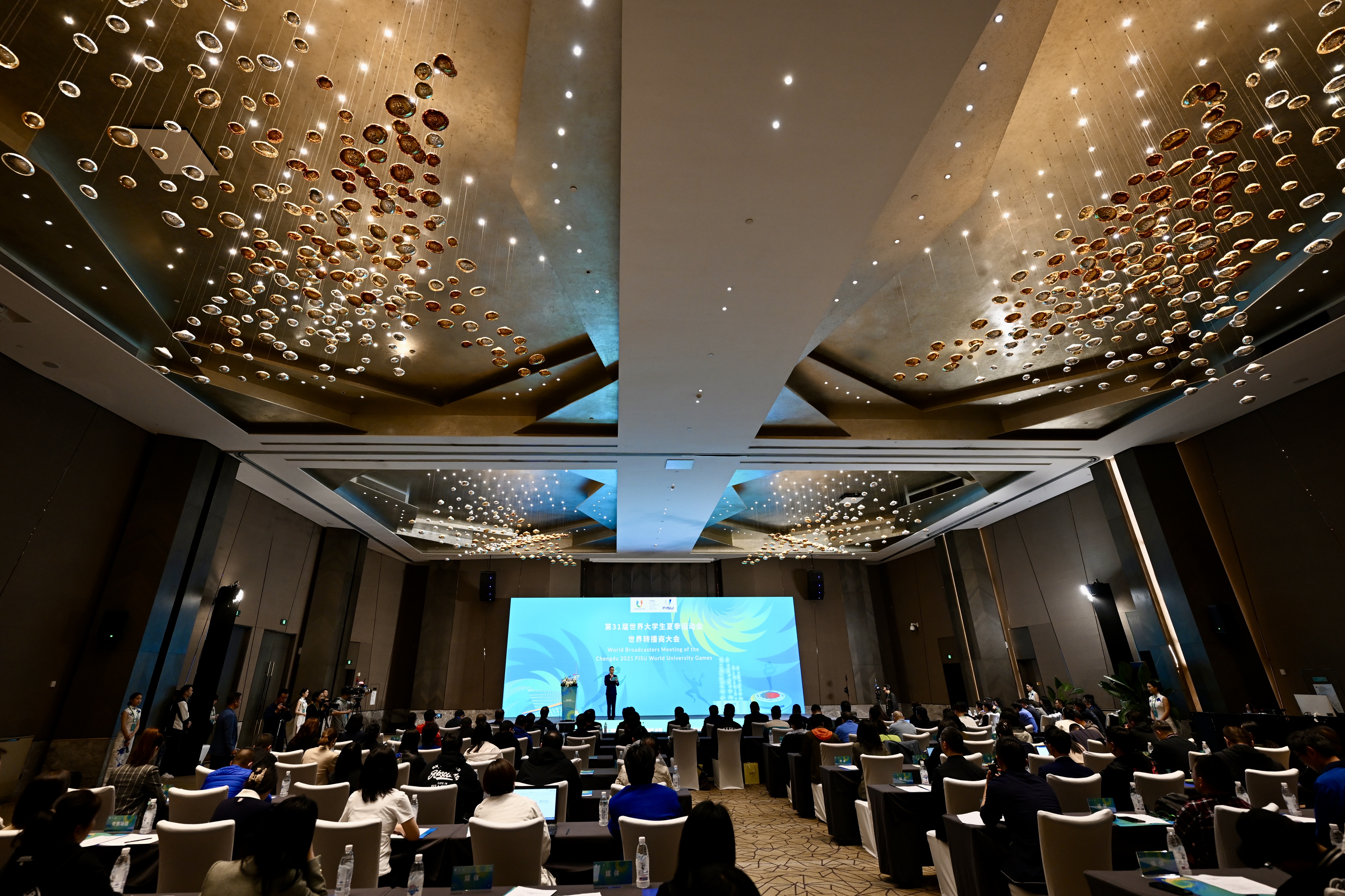 成都大运会国内全媒体独家版权持有者中央广播电视总台(以下简称总台)相关节目部门,意向转播成都大运会的抖音体育、台湾ELTA体育、上海五星体育、山东广播电视台、四川广播电视台、成都市广播电视台等转播商线下参会。国际大体联媒体部,国际大体联FISU.TV团队,Eurosports等国际大体联长期合作转播商,来自法国、西班牙、土耳其、约旦、乌兹别克斯坦等国的转播商,我国香港地区、台湾地区和其它部分省市的转播商线上参会。