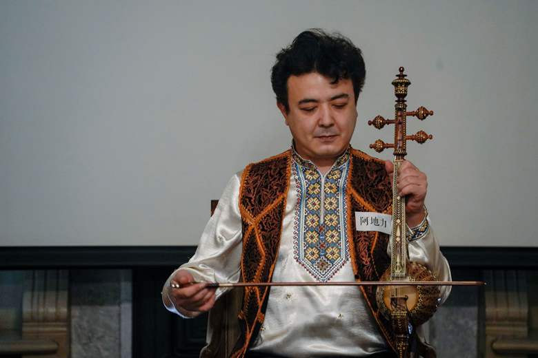 ▲中央民族歌舞团民族管弦乐队拉弦组首席演奏员、艾捷克演奏家阿地力·阿不力孜演奏现场