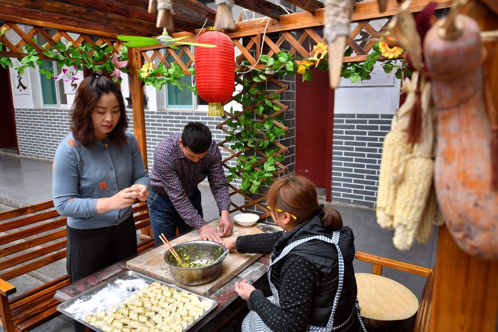 山西省平定县娘子关村一家农家乐的工作人员为顾客包饺子(2019年2月26日摄)。新华社记者 曹阳 摄