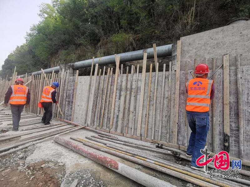 走进苍溪县长征国家文化公园红色旅游景区融合发展基础设施项目施工现场,工人们正在进行河堤挡墙作业。
