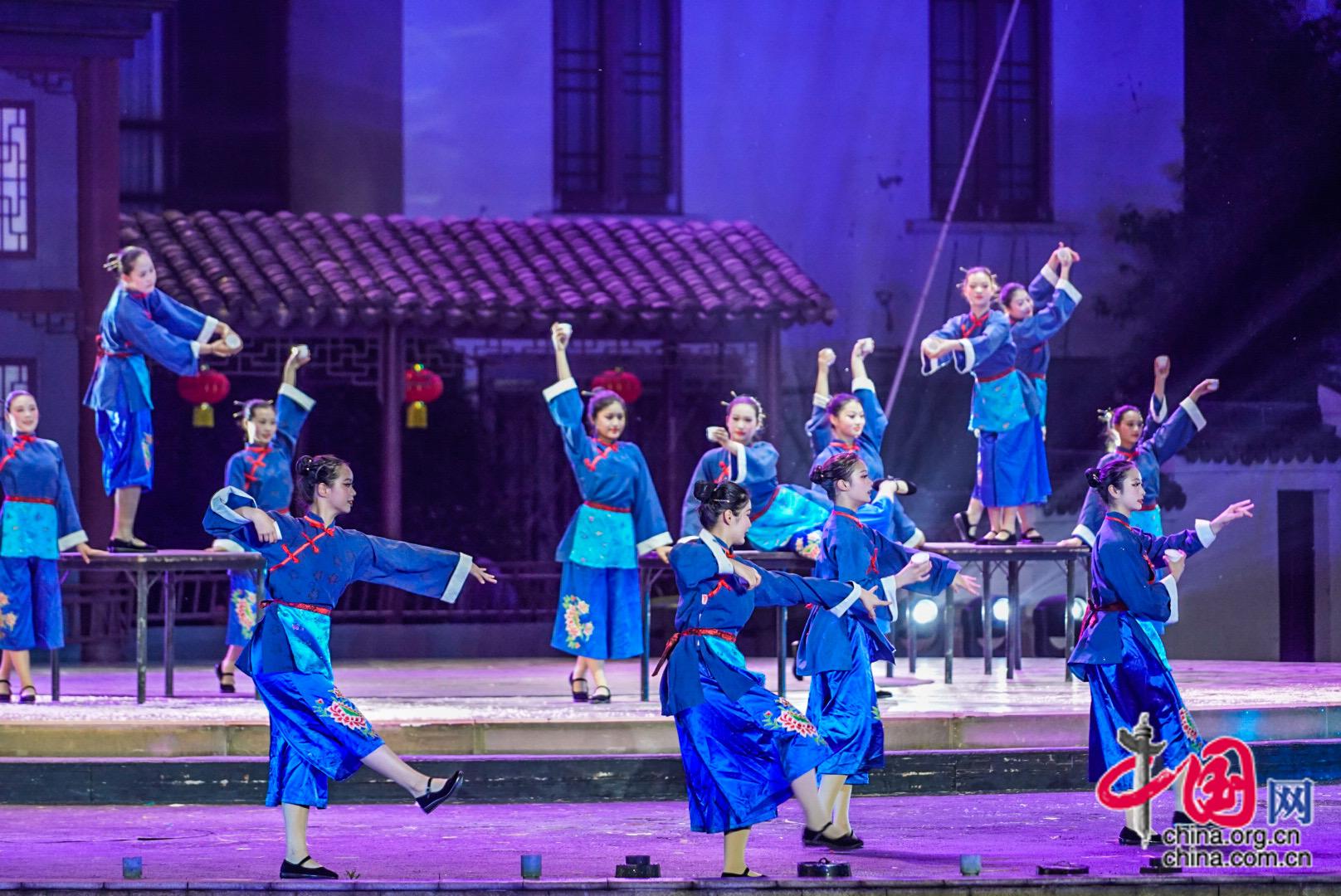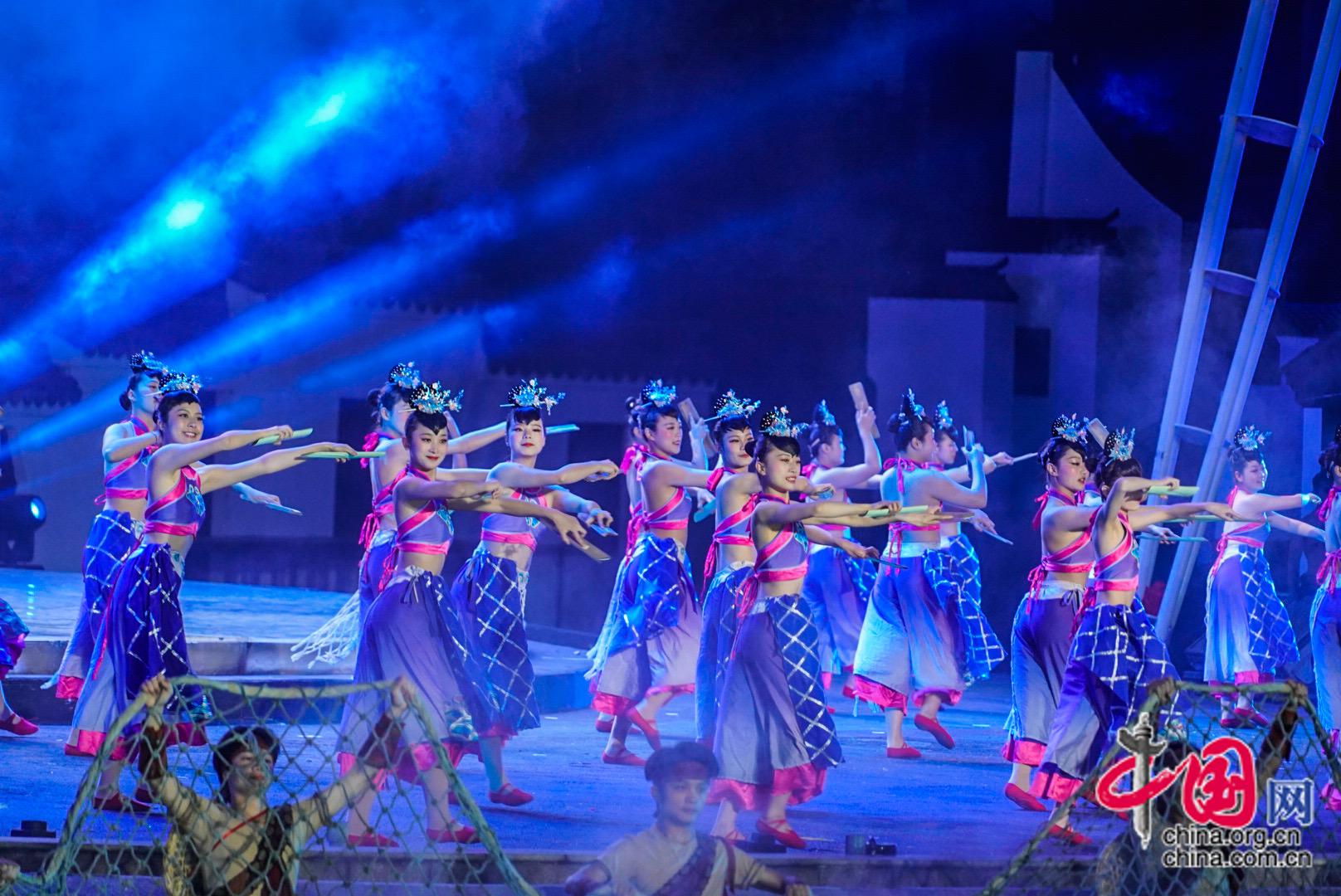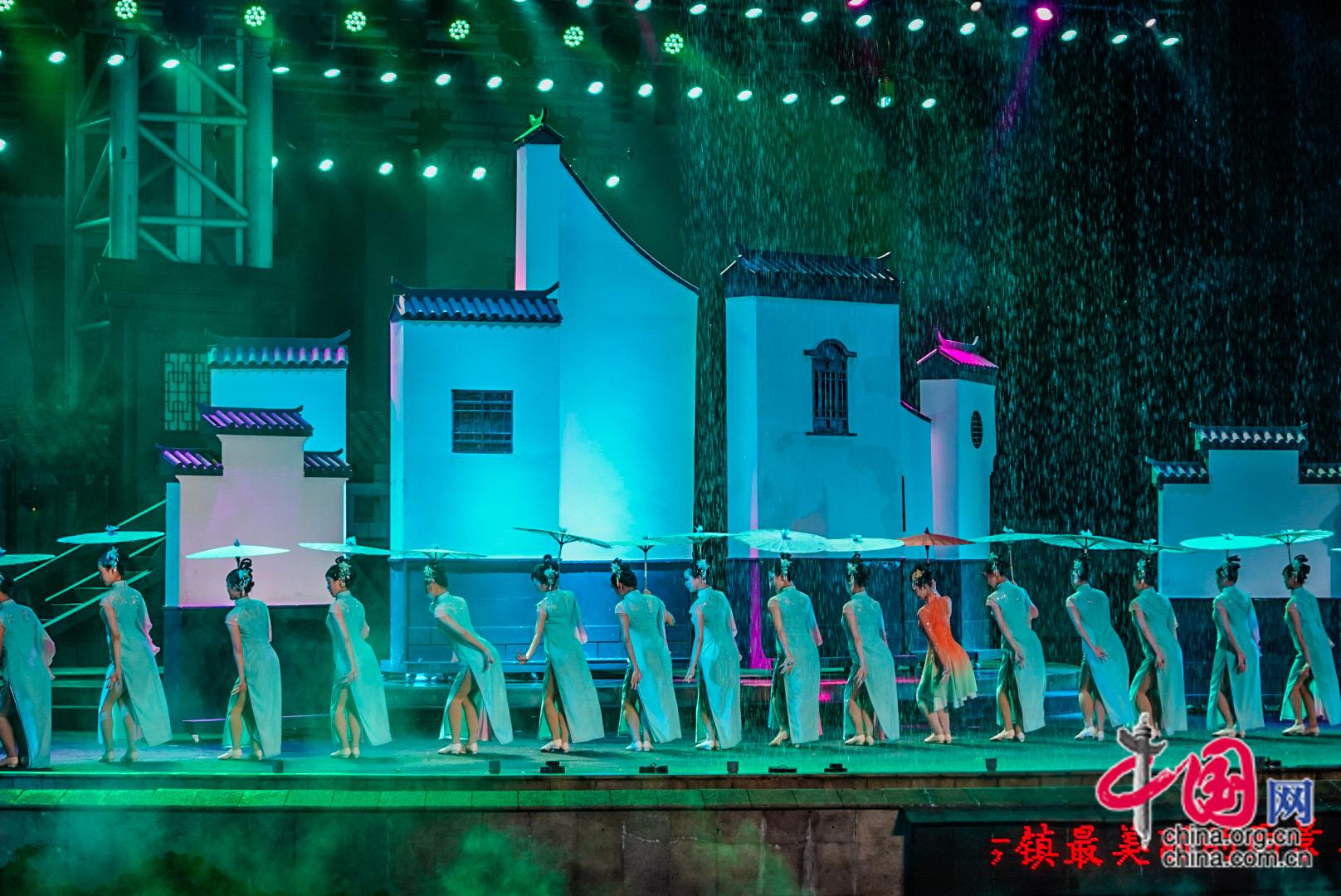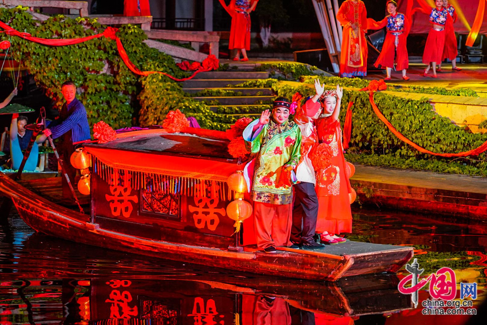 一夜识江南。演出共分为三个篇章,分别为“水韵周庄”“四季周庄”“民俗周庄”。“水韵周庄”以渔歌、渔妇、渔灯、渔作为主要内容,其中《出航》一章,融入杂技艺术,精彩演绎了当年沈万三凭借周庄便利的水路交通出海通番的传奇故事。“四季周庄”以春夏秋冬来展现周庄八景,真实再现了江南的四季生活,体现周庄水乡质朴而热烈,清新而绮丽的美。“民俗周庄”处处洋溢着浓厚的水乡民俗风情,其中《迎财神》《打田财》等水乡习俗配以真实的挑花篮、打连厢、荡湖船等民俗风情展示,表达了老百姓祈求五谷丰登、幸福安康的美好愿望;《水乡婚庆》更是还原了周庄摇快船娶新娘的传统婚庆,通过观众与演员的互动,将整台演出推向高潮。中国第一水乡的原生之美和迷人情韵在这“渔”“耕”“和”三个篇章中尽显。