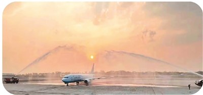 日前,满载150多名乘客的厦航MF8669航班降落在缅甸仰光国际机场,这是厦门—仰光航线自2019年来首次重启。仰光国际机场用“过水门”仪式热情迎接这架航班的到来。
