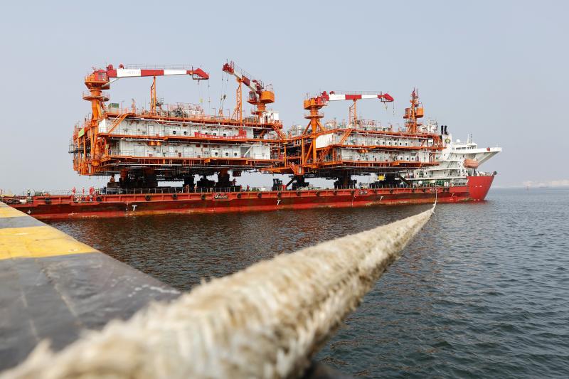 这是8月9日在天津滨海新区拍摄的渤中19-6凝析气田I期开发项目组块装船作业现场。组块装船后将赴渤海西部海域,进入海上安装和联调阶段。