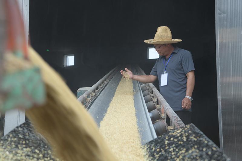 在江西省南昌县横岗国家粮食储备库,工作人员在查看早稻的情况(8月8日摄)。