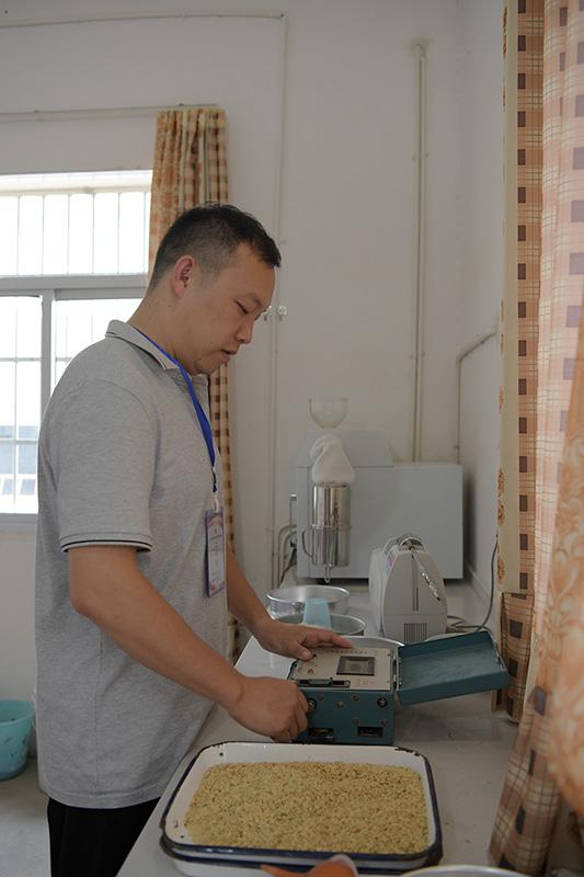 在江西省南昌县横岗国家粮食储备库,工作人员通过设备检测抽样粮食的水分、品质、农药残余、重金属等情况(8月8日摄)。