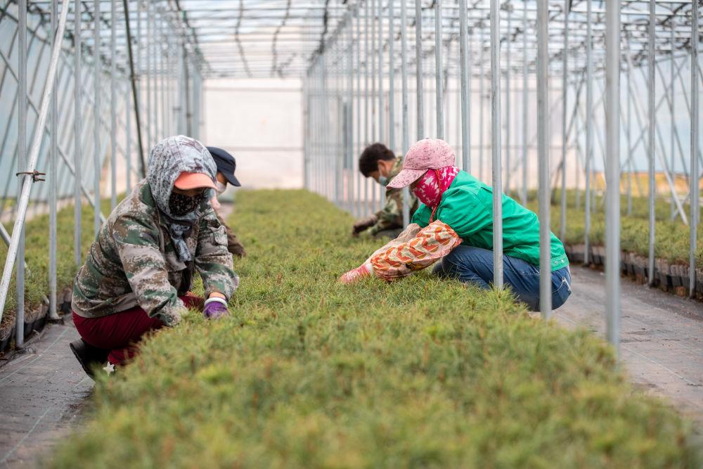 在黑龙江伊春森工集团红松种苗繁育基地,工作人员在养护轻基质红松苗(2023年5月20日摄)。新华社记者 张涛 摄
