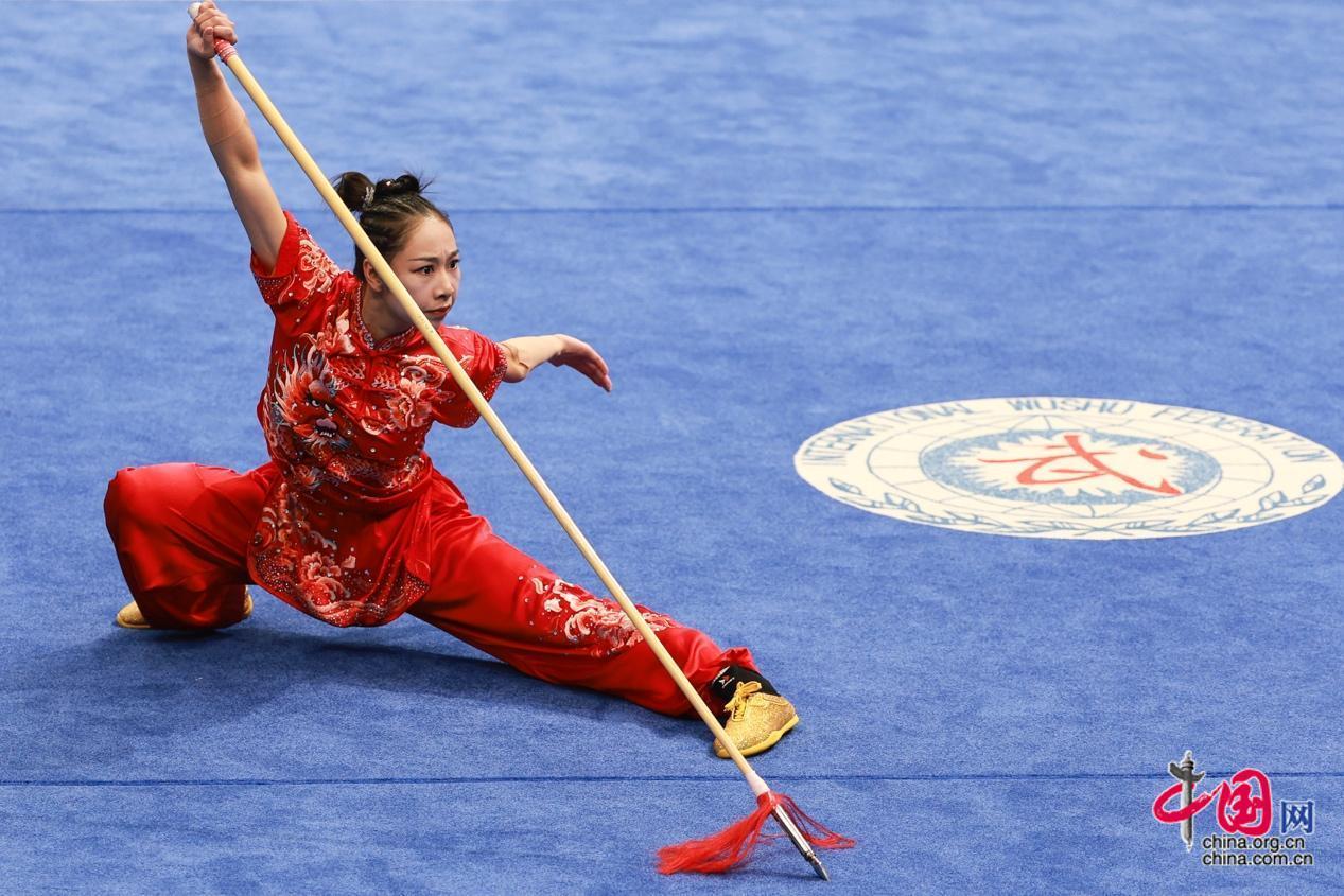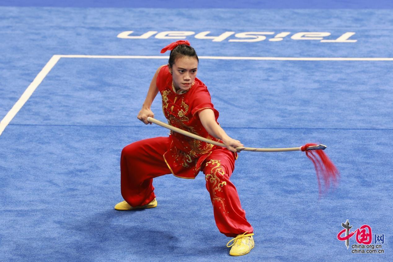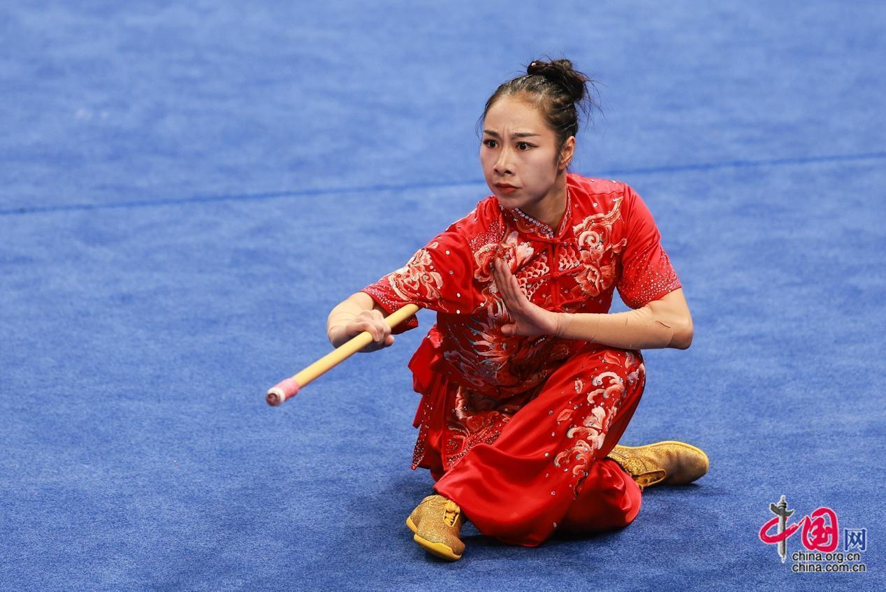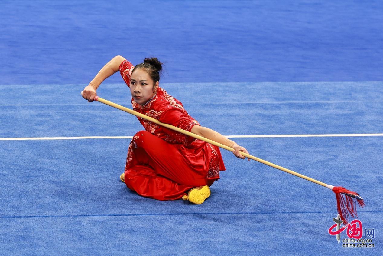 9月27日,杭州第19届亚运会武术女子剑术枪术全能决赛在萧山瓜沥文化体育中心举行,中国选手赖晓晓19.6分的优异成绩摘取桂冠。图为枪术决赛。中国网记者 董宁 摄影