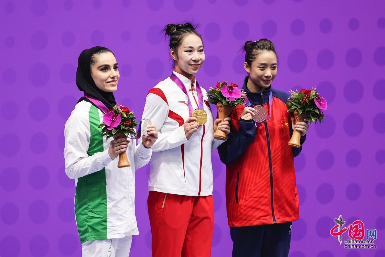 9月27日,杭州第19届亚运会武术女子剑术枪术全能决赛在萧山瓜沥文化体育中心举行,中国选手赖晓晓19.6分的优异成绩摘取桂冠。图为获奖选手在领奖台合影。中国网记者 董宁 摄影