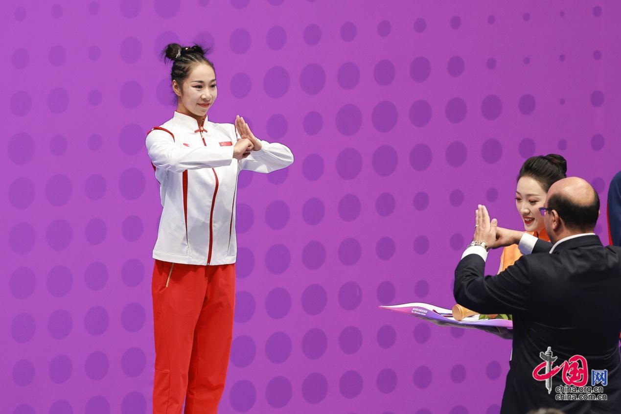 9月27日,杭州第19届亚运会武术女子剑术枪术全能决赛在萧山瓜沥文化体育中心举行,中国选手赖晓晓19.6分的优异成绩摘取桂冠。图为赖晓晓和颁奖嘉宾相互抱拳施礼。中国网记者 董宁 摄影