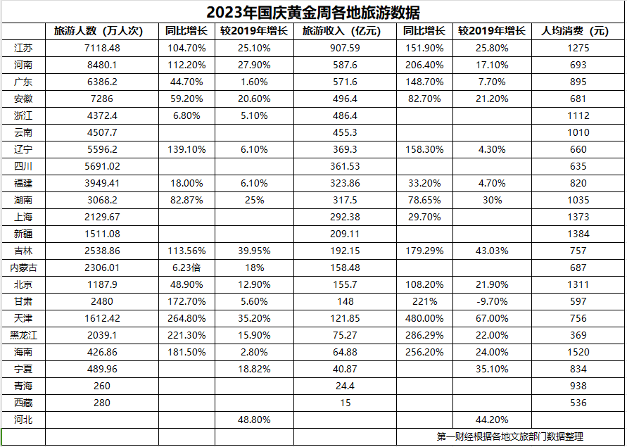 根据江苏省文旅厅数据,江苏省共接待国内游客7118.48万人次,实现旅游总收入907.59亿元,同比2022年分别增长104.7%和151.9%,按可比口径较2019年同期分别增长25.1%和25.8%。江苏省以907.59亿元旅游收入位居各省之首。