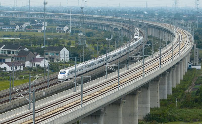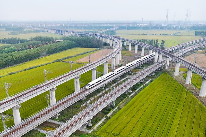 10月10日,列车行驶在沪苏通铁路江苏省太仓市境内(无人机照片)。
