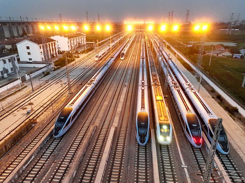 10月10日,动车组列车从南京动车段南京南动车运用所驶出(无人机照片)。