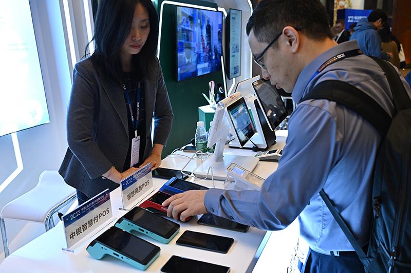 在论坛设置的数字人民币体验区,与会者在中国银行展台了解具有数字人民币功能的POS机(10月12日摄)。