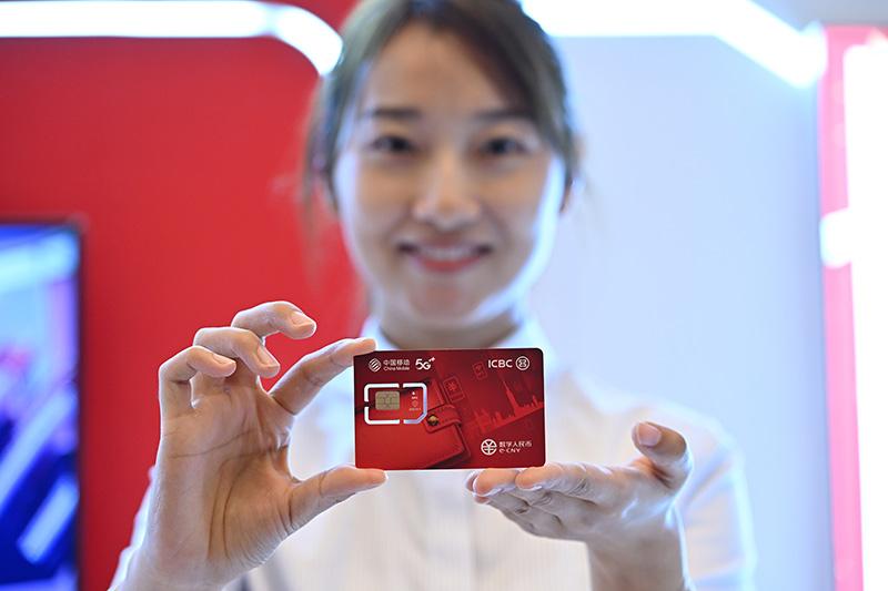 在论坛设置的数字人民币体验区,工商银行展台的工作人员展示一款工商银行与中国移动联合研发的数字人民币SIM卡硬钱包(10月12日摄)。该硬钱包支持无网无电支付。
