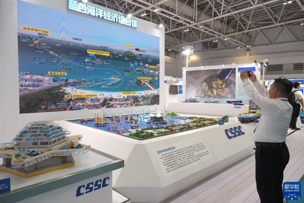10月12日,参观者在2023中国海洋装备博览会上的“蓝色海洋经济综合体”沙盘前拍摄。
