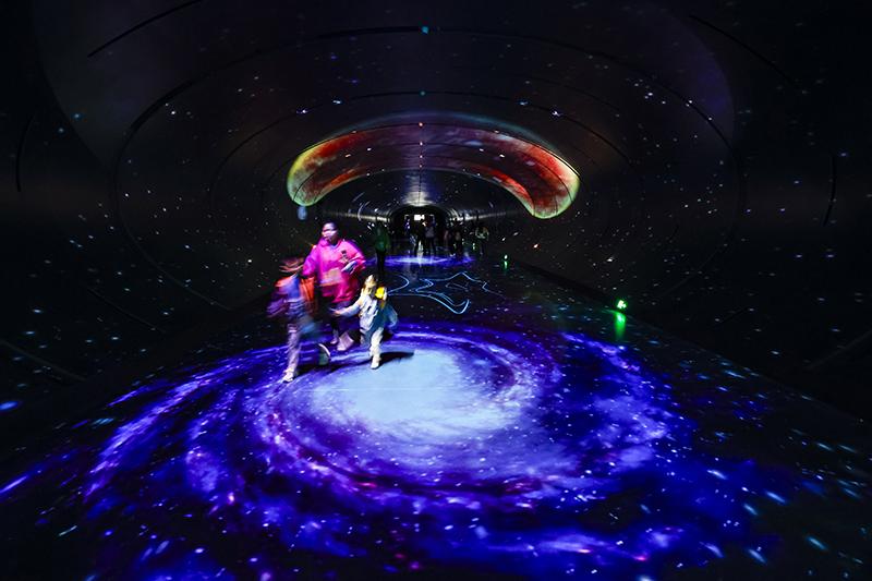 10月18日,在第81届世界科幻大会主场馆——成都科幻馆内,人们走在“时空隧道”内。