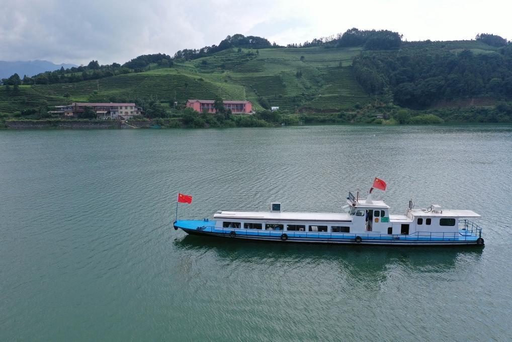 这是2023年7月19日在湖南省安化县拍摄的行驶在资江上的“水上法庭”(无人机照片)。2017年,安化县人民法院设立了巡回水上审判庭,负责审判库区沿岸8个乡镇的各类案件和全县部分具有普法教育意义的环境资源类案件,当地群众称其为“水上法庭”。 新华社记者 薛宇舸 摄