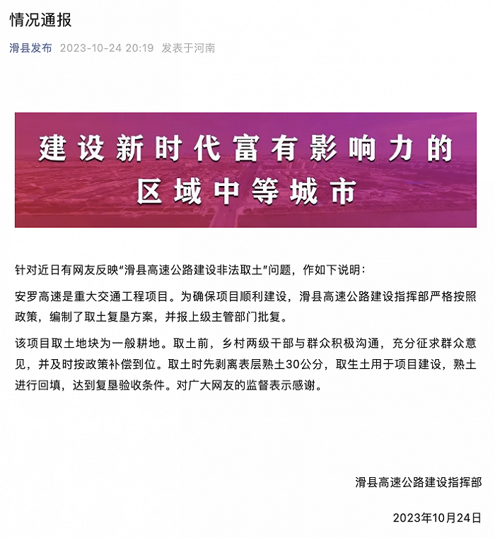 据“滑县发布”微信公众号10月24日消息,针对近日有网友反映“滑县高速公路建设非法取土”问题,河南滑县高速公路建设指挥部通报:安罗高速是重大交通工程项目。为确保项目顺利建设,滑县高速公路建设指挥部严格按照政策,编制了取土复垦方案,并报上级主管部门批复。该项目取土地块为一般耕地。取土前,乡村两级干部与群众积极沟通,充分征求群众意见,并及时按政策补偿到位。取土时先剥离表层熟土30公分,取生土用于项目建设,熟土进行回填,达到复垦验收条件。