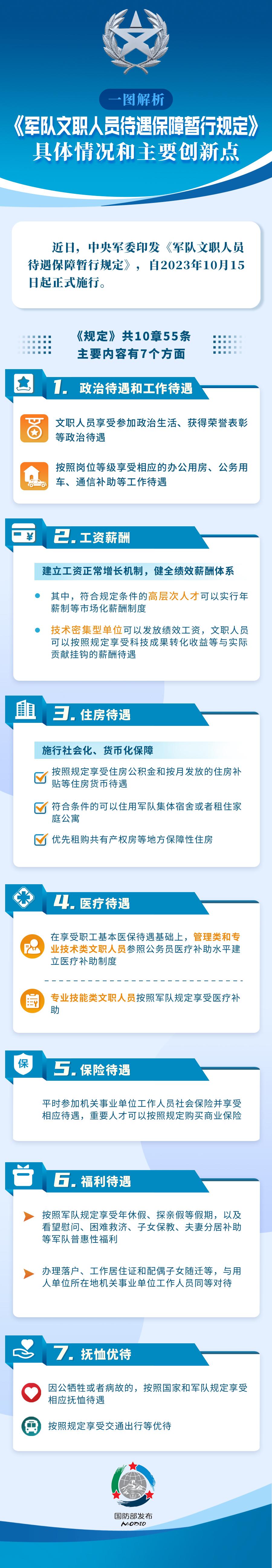 《规定》共10章55条,主要内容有7个方面:一是政治待遇和工作待遇。文职人员享受参加政治生活、获得荣誉表彰等政治待遇,按照岗位等级享受相应的办公用房、公务用车、通信补助等工作待遇。二是工资薪酬。建立工资正常增长机制,健全绩效薪酬体系。其中,符合规定条件的高层次人才可以实行年薪制等市场化薪酬制度,技术密集型单位可以发放绩效工资,文职人员可以按照规定享受科技成果转化收益等与实际贡献挂钩的薪酬待遇。三是住房待遇。施行社会化、货币化保障,按照规定享受住房公积金和按月发放的住房补贴等住房货币待遇,符合条件的可以住用军队集体宿舍或者租住家庭公寓,优先租购共有产权房等地方保障性住房。四是医疗待遇。在享受职工基本医保待遇基础上,管理类和专业技术类文职人员参照公务员医疗补助水平建立医疗补助制度,专业技能类文职人员按照军队规定享受医疗补助。五是保险待遇。平时参加机关事业单位工作人员社会保险并享受相应待遇,重要人才可以按照规定购买商业保险。六是福利待遇。按照军队规定享受年休假、探亲假等假期,以及看望慰问、困难救济、子女保教、夫妻分居补助等军队普惠性福利。办理落户、工作居住证和配偶子女随迁等,与用人单位所在地机关事业单位工作人员同等对待。七是抚恤优待。因公牺牲或者病故的,按照国家和军队规定享受相应抚恤待遇。按照规定享受交通出行等优待。