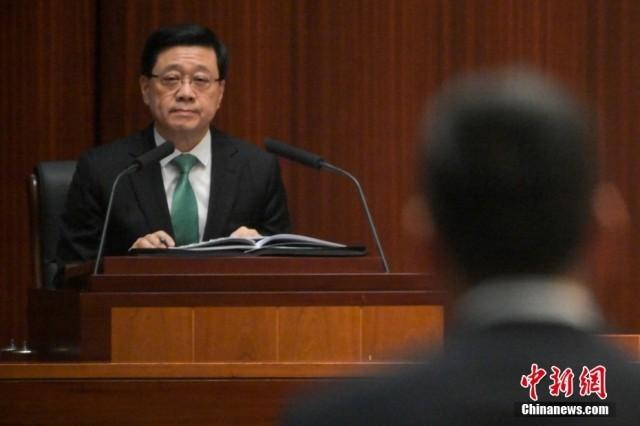 10月26日,香港特区行政长官李家超出席立法会《行政长官2023年施政报告》答问会,回答立法会议员提问。图为李家超回答提问。