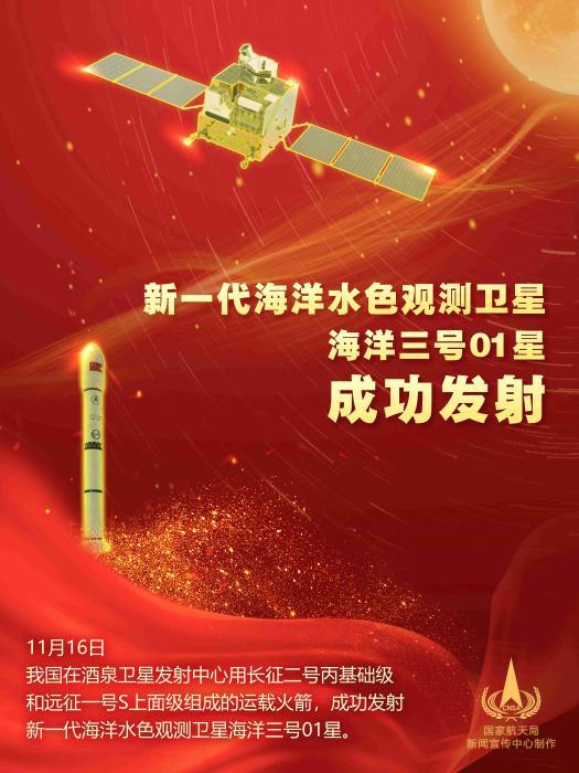 中新网酒泉11月16日电 (马帅莎 张未)11月16日11时55分,中国在酒泉卫星发射中心用长征二号丙基础级和远征一号S上面级组成的运载火箭,成功发射新一代海洋水色观测卫星海洋三号01星。该卫星指标达到国际水色遥感卫星先进水平,可满足中国海洋环境监测的主体业务需求,并能够服务于生态文明建设、智慧海洋工程建设、“一带一路”倡议等国家重大战略需求。