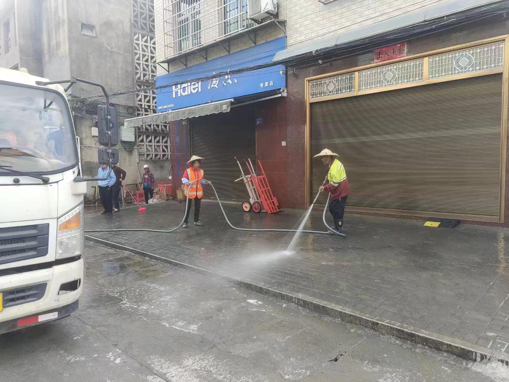 在长庆镇的主要街道上,工作人员还使用高压水枪,对街面以及街边的垃圾桶进行了冲洗清理。经过他们的辛勤努力,原本略显陈旧的街道焕发出了新的生机,整个镇区呈现出一片整洁、明亮的景象。
