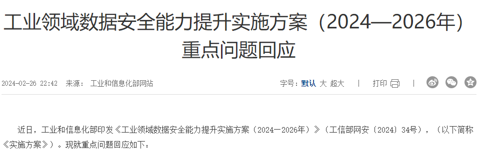 工业和信息化部近日印发《工业领域数据安全能力提升实施方案(2024—2026年)》,提出到2026年底,我国工业领域数据安全保障体系基本建立。