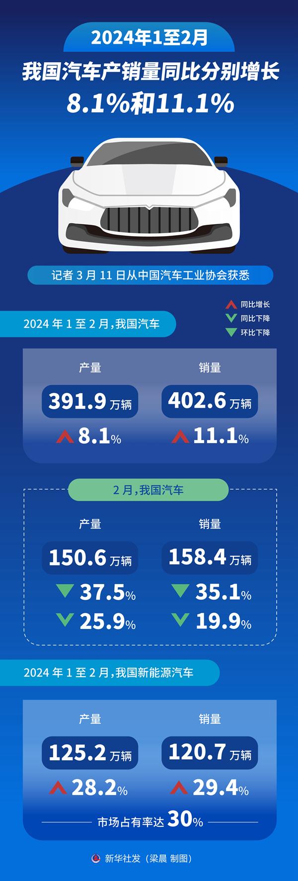 新华社北京3月11日电(记者高亢)记者11日从中国汽车工业协会获悉,1至2月,我国汽车产销量分别达391.9万辆和402.6万辆,同比分别增长8.1%和11.1%。