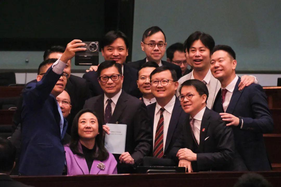 图为部分立法会议员与香港特区政府保安局局长邓炳强(手持条例草案者)自拍。