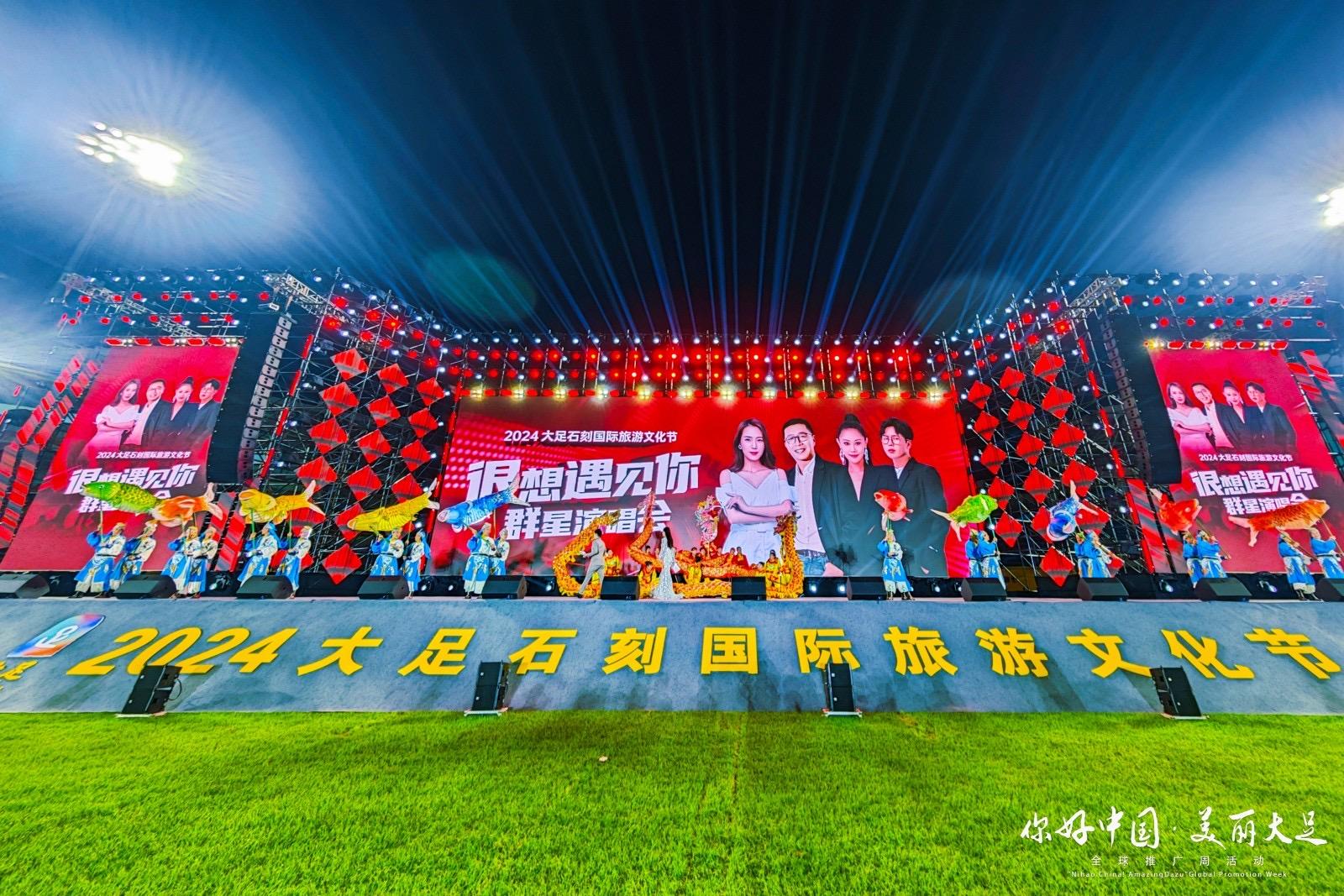 此外,还同步举行了2024大足石刻国际旅游文化节“很想遇见你”群星演唱会,庞龙、梦然、云朵、阿冗等知名歌手都带来了他们的经典作品,为游客和市民带来一场高品质的视听盛宴。现场除了明星献唱,还有鲤鱼灯舞、非遗舞龙等系列文艺表演。向世界展现出大足广邀八方宾客,共襄文化盛宴的热情和底气。