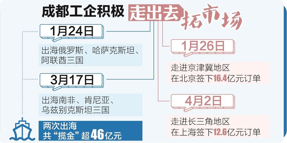 在1月26日的开拓市场供需对接会——京津冀专场上,7家成都企业与15家京津冀地区合作伙伴签订订单协议,协议金额16.4亿元。一季度,成都工企代表团两次“出海”,前往南非、肯尼亚、乌兹别克斯坦等国家和地区,揽金超46亿元。