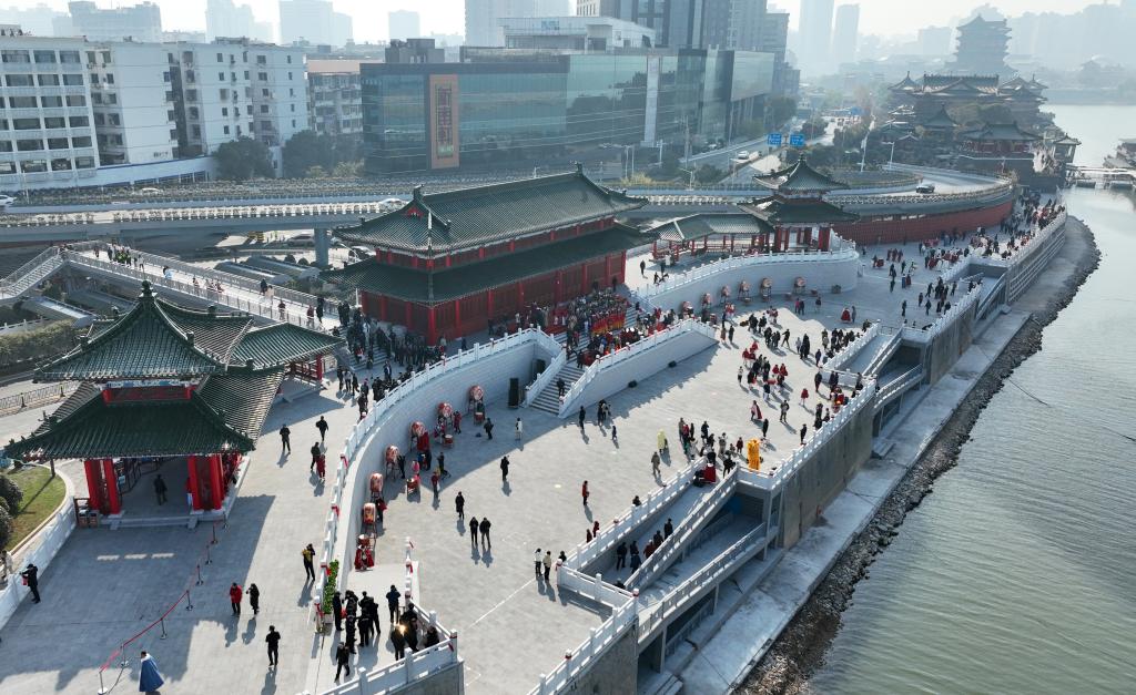 1月1日,游客们在南昌滕王阁景区北扩码头公园参观游览(航拍照片)。新华社记者 万象 摄