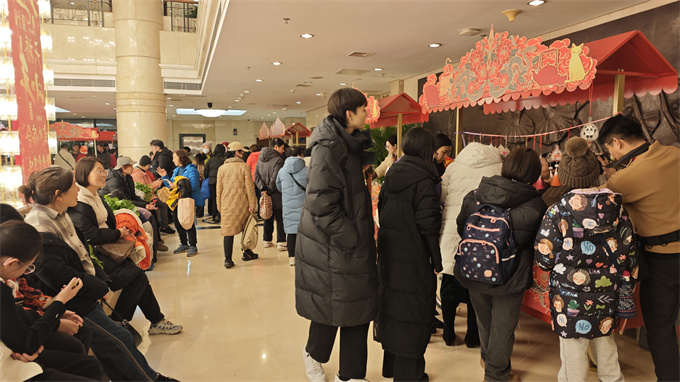 活动期间,天桥剧场里张灯结彩,热闹非凡。非遗剪纸、掐丝珐琅、非遗花丝镶嵌首饰和配饰、非遗绳结中国结等精湛非遗手艺、趣味民俗活动、年味十足的互动体验等主题区域琳琅满目,吸引着八方来客。