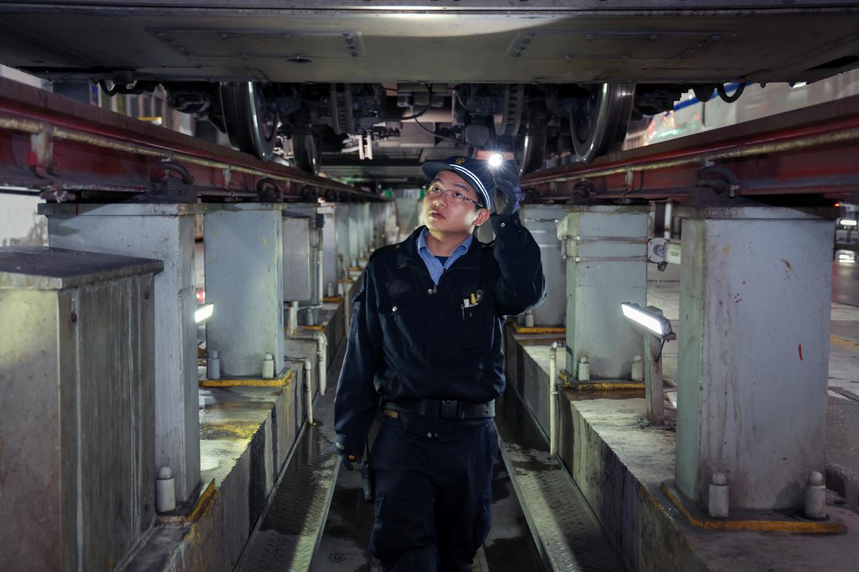 检修人员聂大铨进入股道地沟,开始对车底进行检查。地沟空间狭小,车底零部件复杂繁多,作业人员需要举着摄像手电筒在地沟里移动,使出浑身解数对零部件进行全方位检查。“站、蹲、伸、探,这一系列动作,他们一晚上要重复上千次。”聂大铨介绍,为保证检修效率和质量,他们查看的每一个螺栓和部件都有着明确的要求,经过长时间“练习”,每一个跨步、后侧步、蹲下、抬头等动作都非常规律和迅速,节奏非常紧凑。