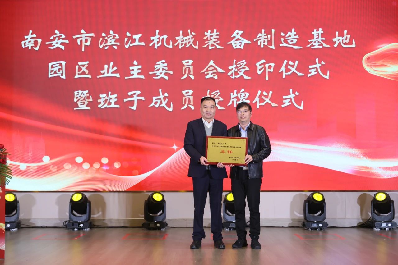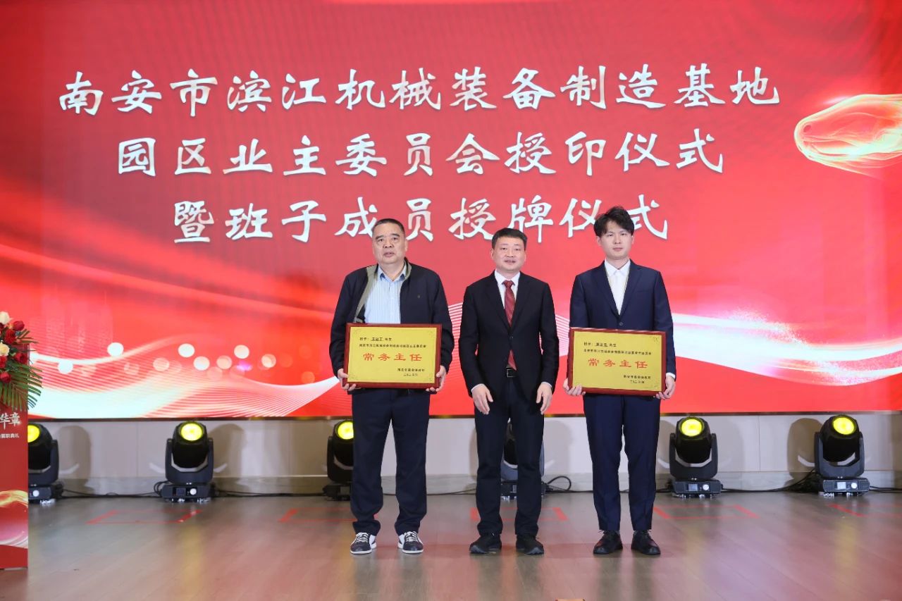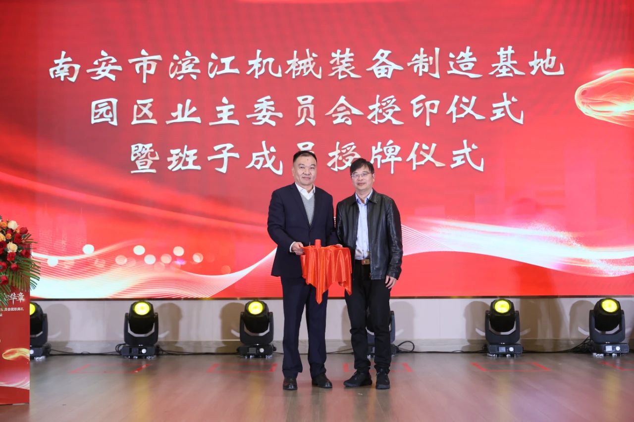 现场宣读了关于同意成立中国共产党南安市滨江机械装备制造基地企业支部委员会的批复、宣布南安市滨江机械装备制造基地园区业主委员会班子名单,并为中国共产党南安市滨江机械装备制造基地企业支部委员会、南安市滨江机械装备制造基地园区业主委员会授印以及为班子成员授牌。其中,福建群峰机械有限公司董事长徐金山任基地园区业主委员会主任。