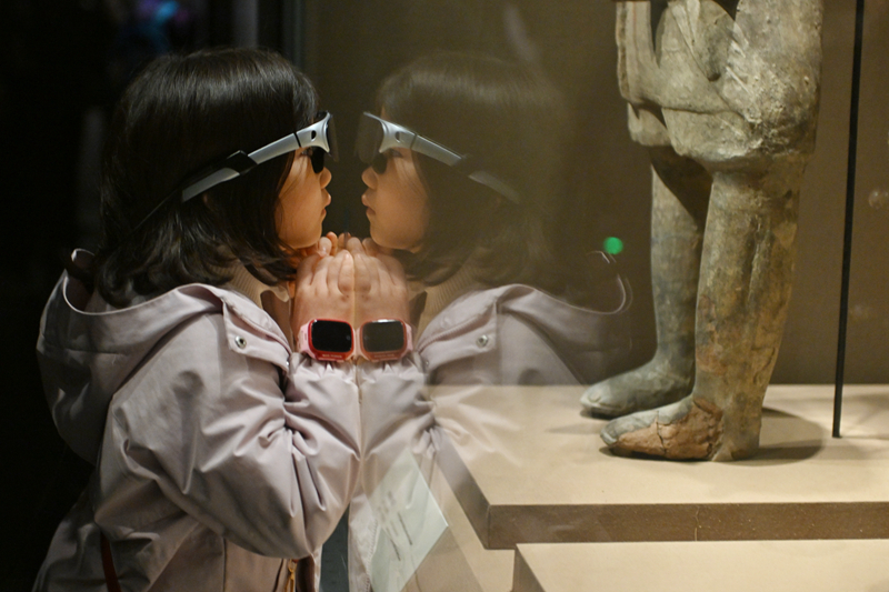 2月3日,在成都博物馆,一名小朋友使用AR眼镜智慧讲解器参观。