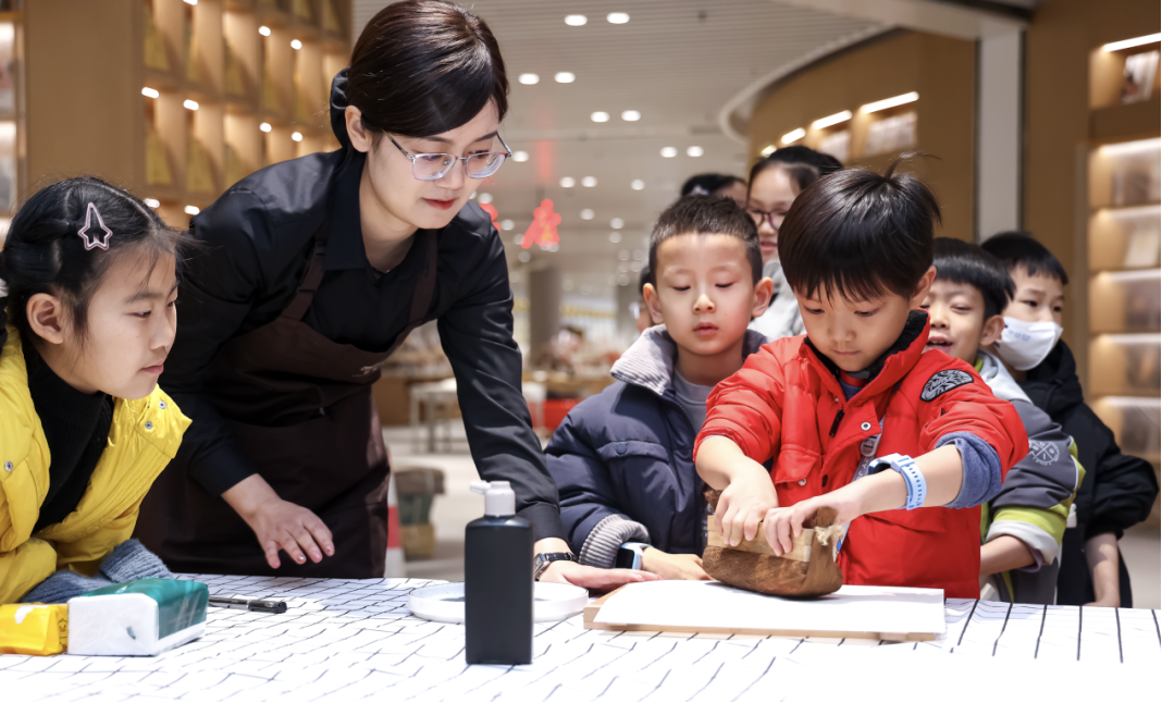 在长安书院三层的书香工坊,专业老师正在带领学生们了解汉字的演变历程,文字载体的变迁,造纸术的出现与改进……“学生们可以通过学习详细了解古法造纸的每一道工序、体验雕版印刷、活字印刷等技艺,在这里过一个传统文化年。”现场老师介绍道。