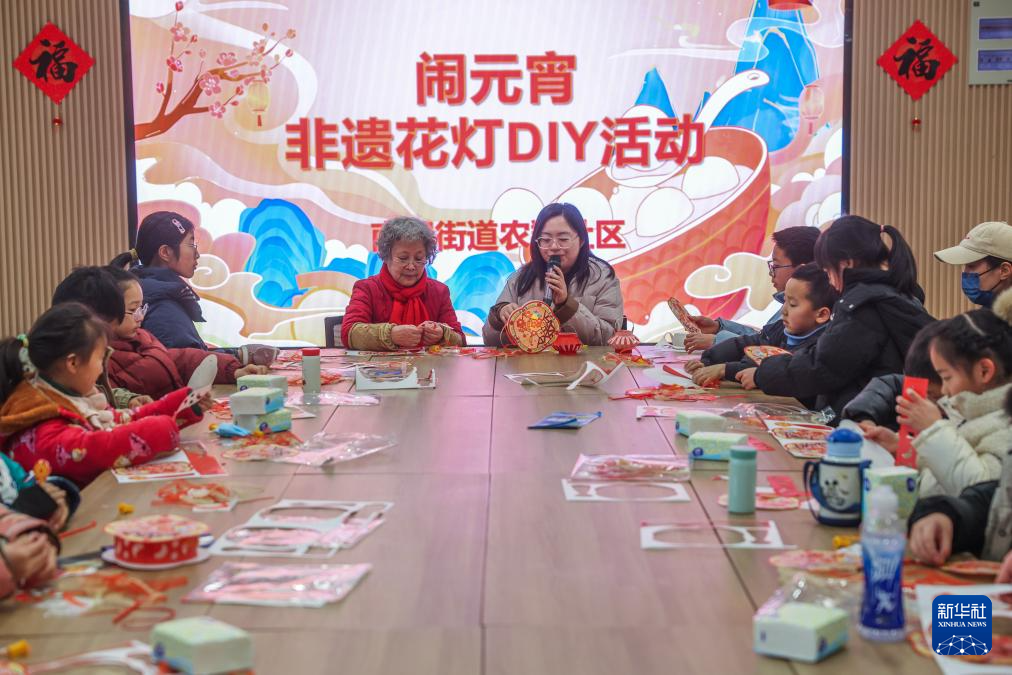 2月6日,嘉兴市南湖区南湖街道农翔社区的志愿者带领居民一起做元宵花灯。新华社记者 徐昱 摄