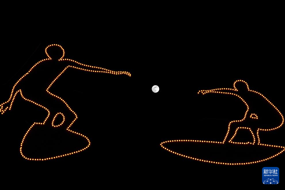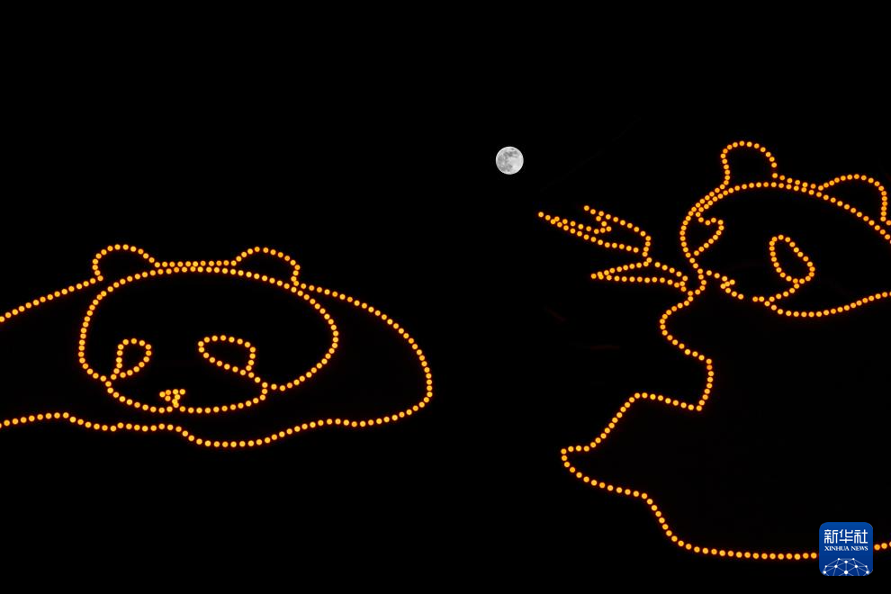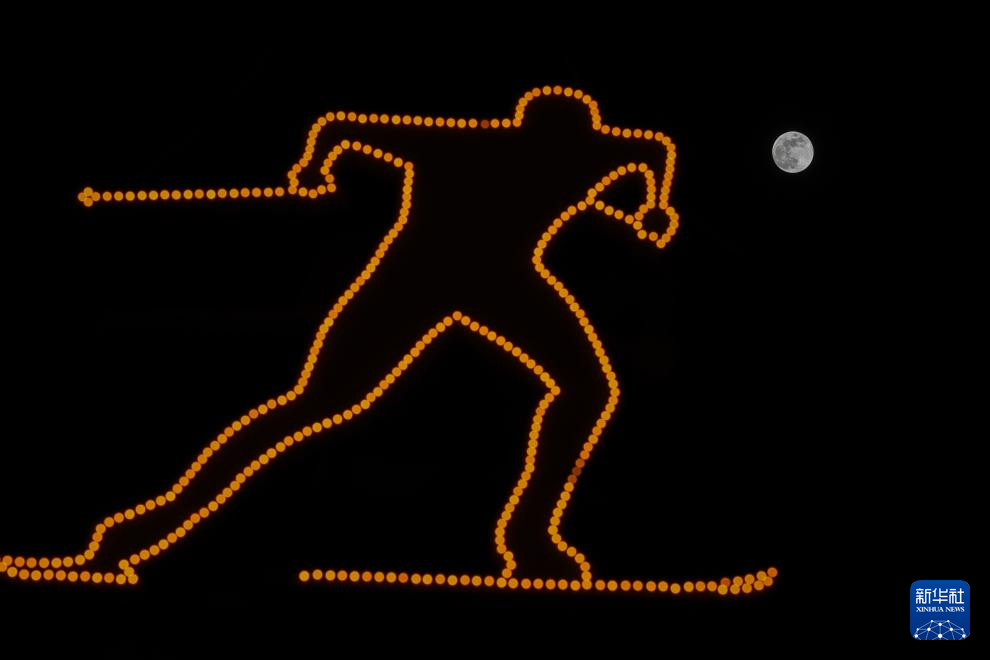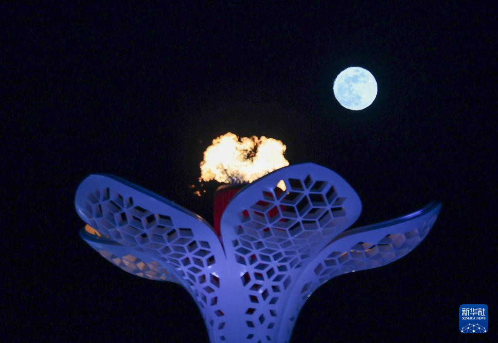 2月12日,一轮圆月从亚冬会主火炬上升起。新华社记者 黄伟 摄