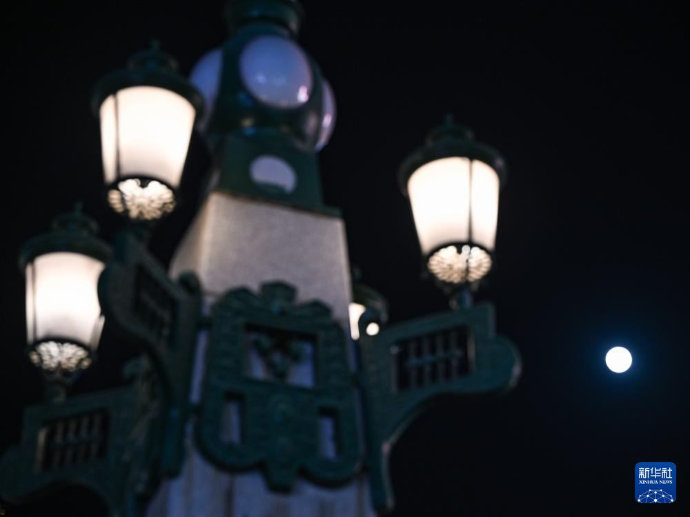 这是2月12日在哈尔滨人民防洪胜利纪念塔拍摄的月亮。新华社记者 黄博涵 摄