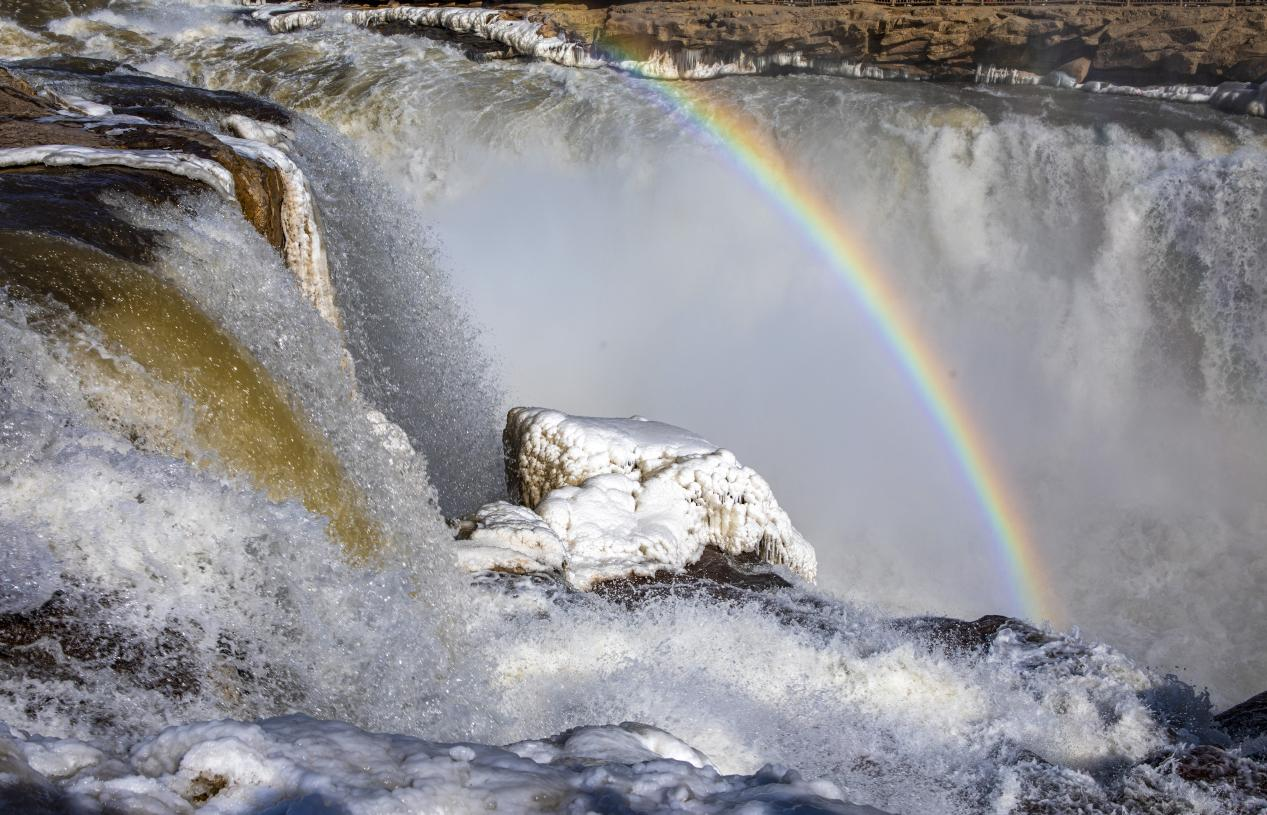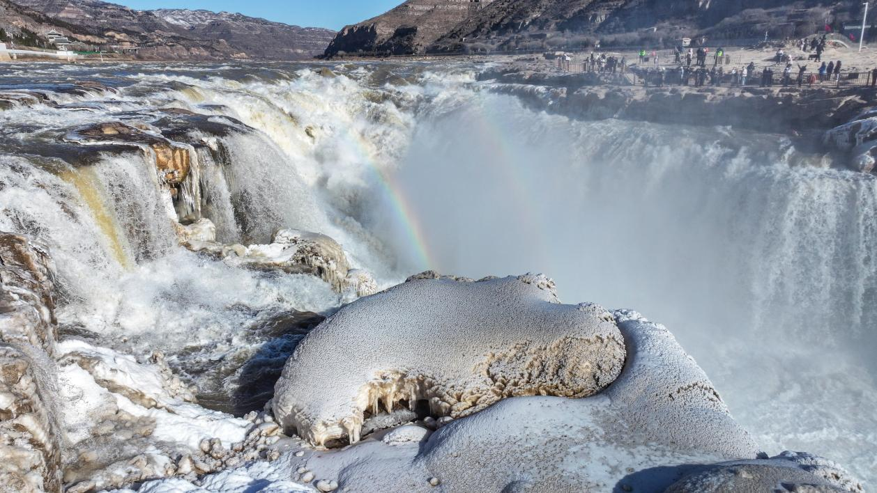 陕西黄河壶口瀑布:冰瀑奇观映彩虹,元宵民俗韵味浓