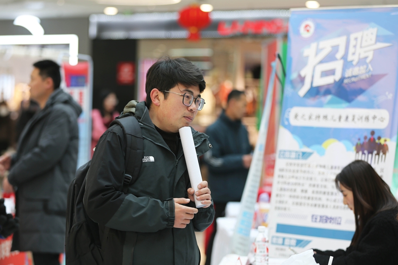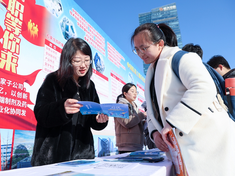 2月15日,在石家庄市解放广场举行的2025年河北省春季大型招聘会上,求职者了解招聘信息。