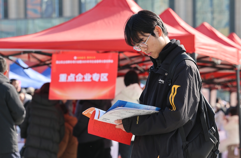 2月15日,在石家庄市解放广场举行的2025年河北省春季大型招聘会上,一名求职者在查看招聘信息。