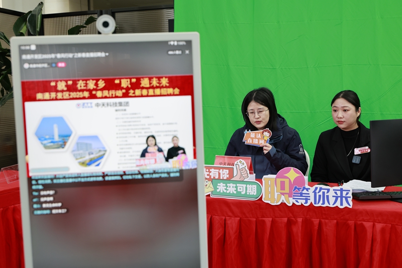 2月15日,在江苏省南通开发区举行的新春综合招聘会上,工作人员进行带岗直播。